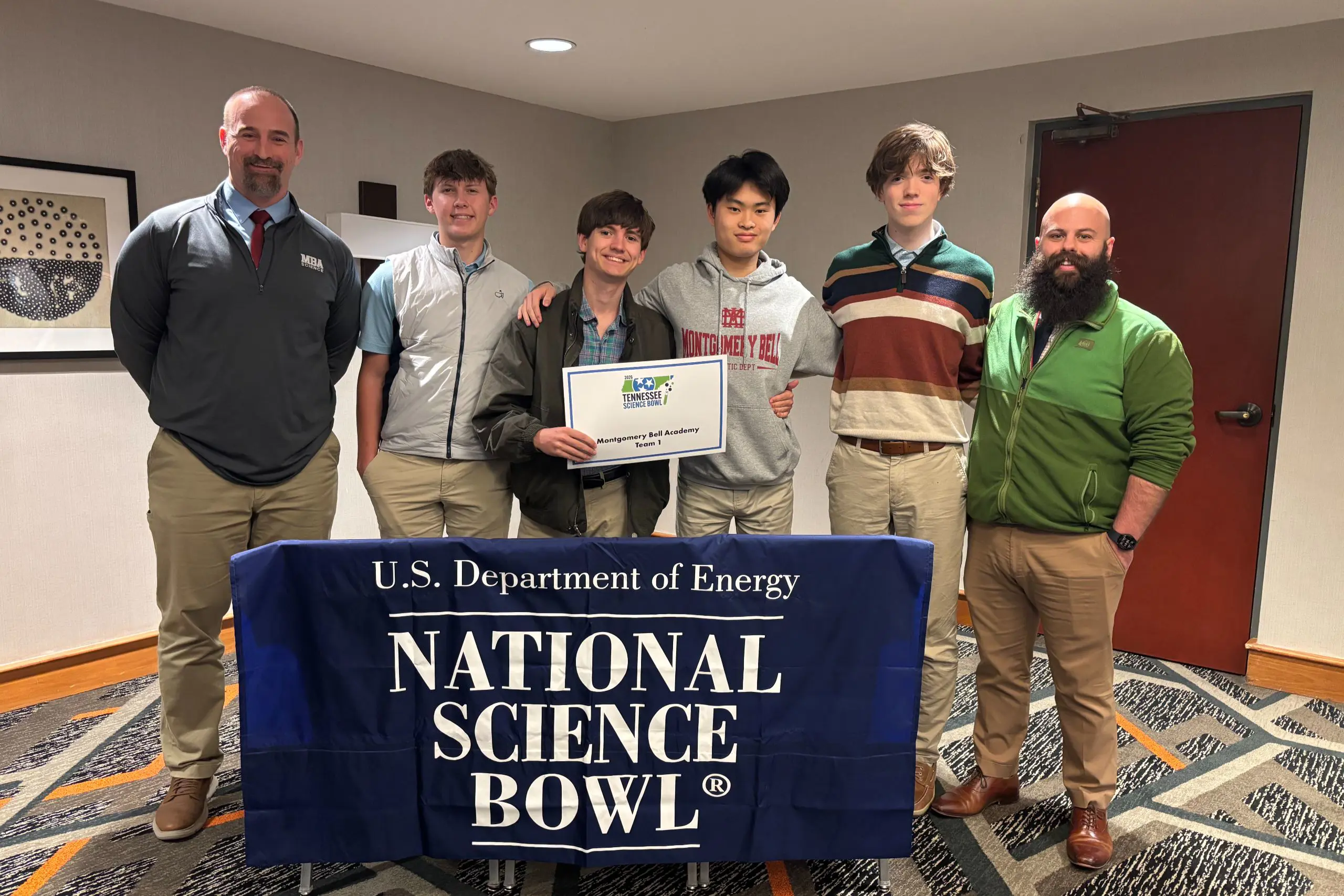The Tennessee Science Bowl — the largest regional competition of its kind in the country — challenges students to answer rapid-fire questions in math and science while collaborating strategically as a team. Representing MBA were Piers Barnard, Justin Guo, James Hood, and Bo Schlosser, who competed in seven preliminary matches before advancing to the elimination round. The event demands quick thinking, deep content knowledge, and seamless teamwork — skills that mirror the collaborative nature of real scientific work.